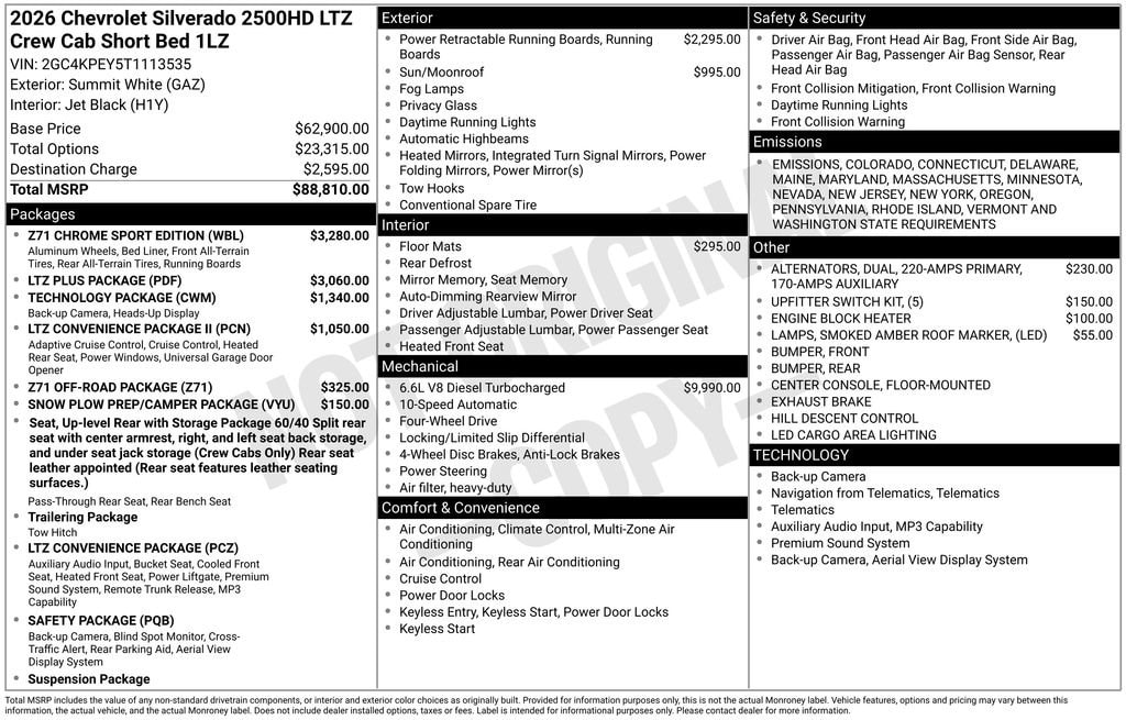 Experience the Ultimate Heavy-Duty Power! This brand-new 2026 Chevrolet Silverado 2500HD LTZ combines rugged capability with luxury comfort. The legendary Duramax 6.6L V8 Turbodiesel delivers an impressive 470HP, while the 10-speed automatic transmission and Autotrac 4WD system ensure you're ready for any job or adventure.