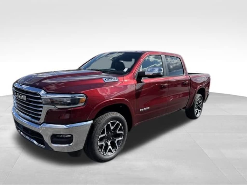 Make a statement in this 2026 Ram 1500 Laramie Crew Cab 4×4, wrapped in eye-catching Delmonico Red Pearlcoat with a rich black leather interior. Under the hood, the efficient and potent 3.0 L Hurricane twin-turbo I6 backed by an 8-speed automatic and four-wheel drive promises a pickup that’s both capable and refined.